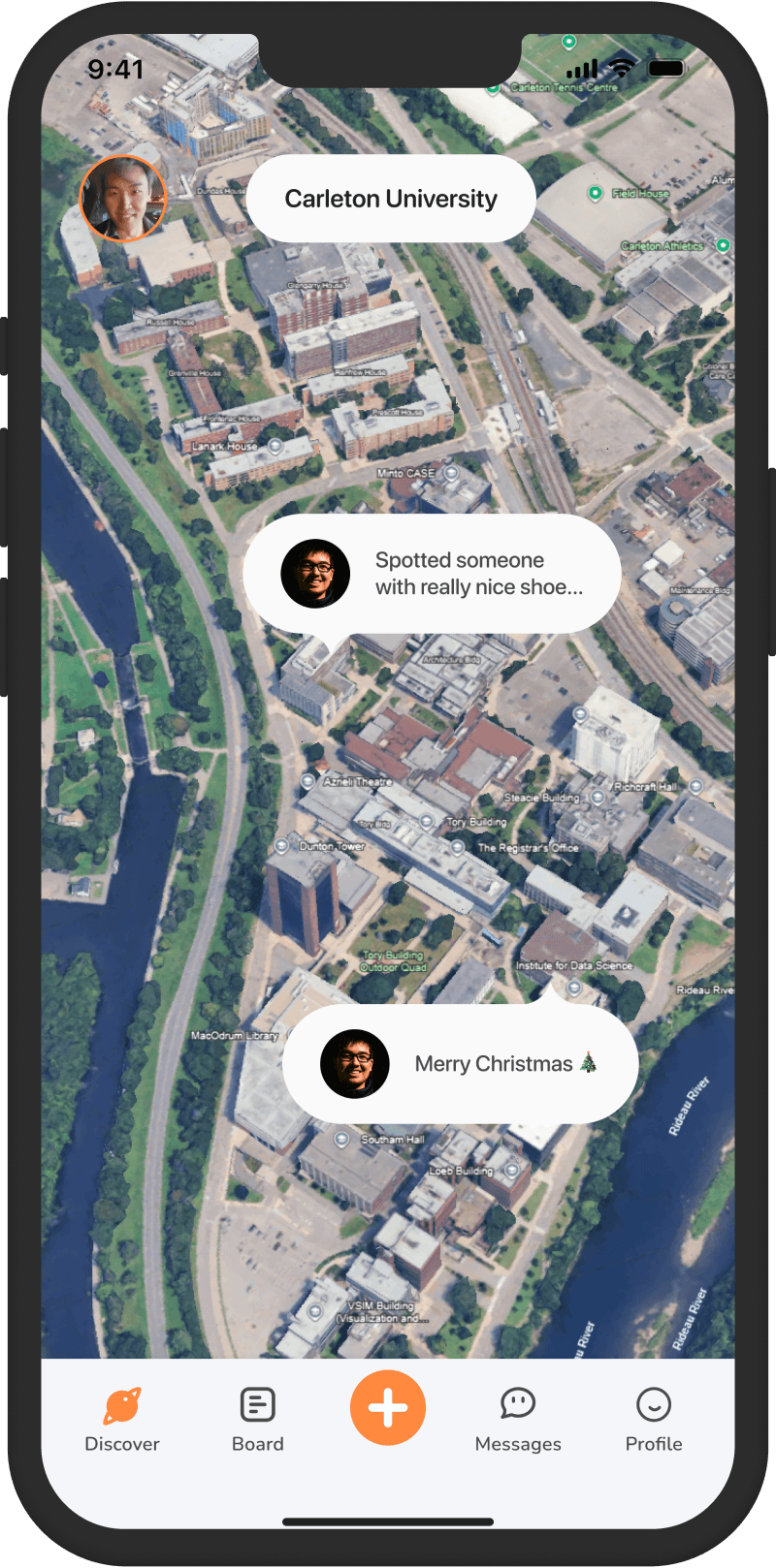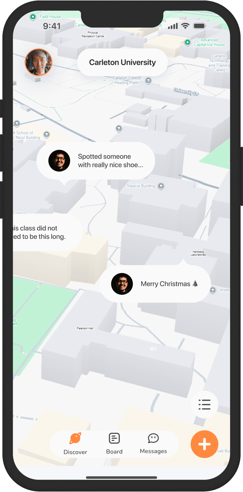 Concept 2. Home page as a campus map where students share thoughts as message bubbles pinned to locations.